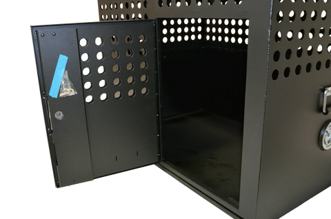 Professional K9 Series XL Tactical Dog Crate. Large police and military working dog crate. Manufactured from heavy duty .090 mill finish aluminum, this crate is built tough for heavy use. Fully powder coated textured black inside and out. Double wall door has a stainless T-handle with 3-point latching system for strength and security and is slotted for a crate cooling fan. Locking mechanism covered on the inside to deter K9 from biting at it and trying to open door. Features spring loaded rattle-free carrying handles and heavy-duty D-rings to secure crate in your vehicle. Side entry door. All measurements are in Inches.