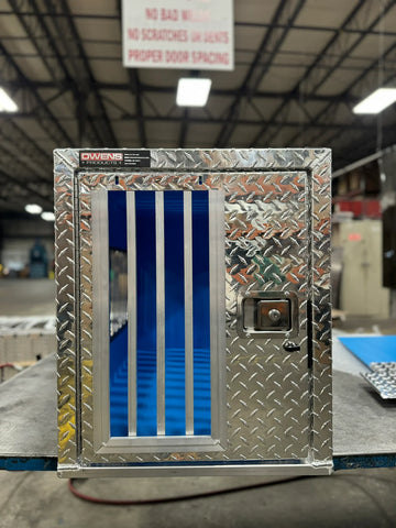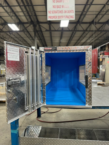 Our Hunter Series Dog Boxes feature a rugged diamond tread aluminum construction, large lined dog compartments with lockable slam latch doors, either with Standard Vents or All Seasons Vents for maximum air flow. Owens Products Hunter Series Dog Boxes are available in single, double or triple compartments, with or without top storage.