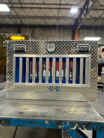 Hunter Series Single Compartment Dog Box. This single compartment dog box features a rugged diamond tread aluminum construction. Dog compartment is lined with plastic corrugate. Lockable slam latch door with storm cover is slotted for a crate cooling fan. Vented with all seasons oversized side (12 x 30) vents for maximum air flow with storm covers. Premium rattle-free spring loaded carrying handles. D-rings that can be utilized to strap down in your vehicle. All measurements are in Inches.