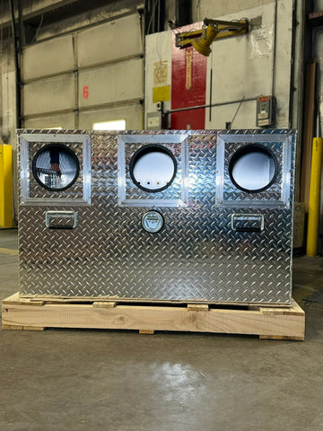 Our Hunter Series Dog Boxes feature a rugged diamond tread aluminum construction, large lined dog compartments with lockable slam latch doors, either with Standard Vents or All Seasons Vents for maximum air flow. Owens Products Hunter Series Dog Boxes are available in single, double or triple compartments, with or without top storage.