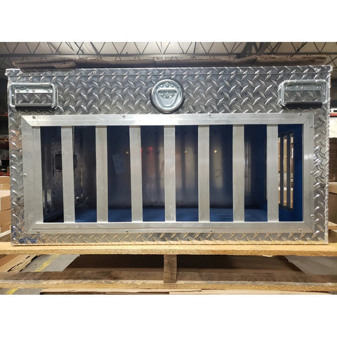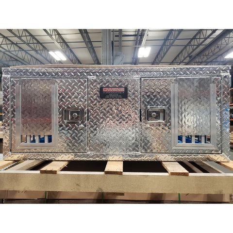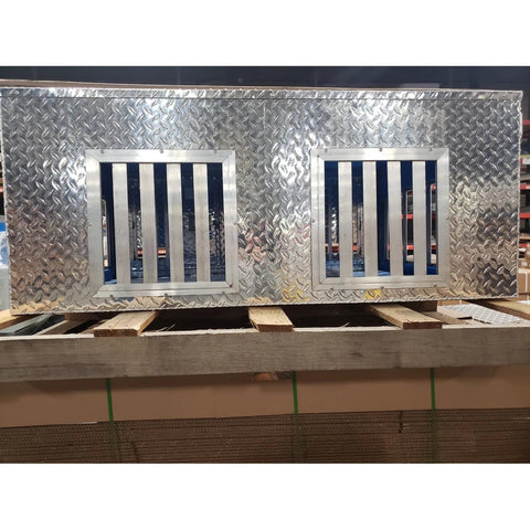 Shallow Double Compartment Dog Box. This crossover dog box features a rugged diamond tread aluminum construction with dual shallow dog compartments lined with plastic corrugate. Lockable slam latch doors with storm covers are slotted for crate cooling fans. Vented for air flow with storm covers. Center divider has air holes for cross ventilation between the compartments. All measurements are in Inches.