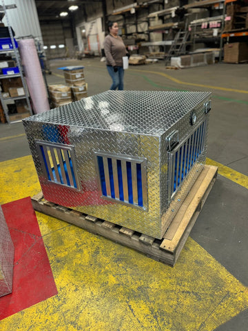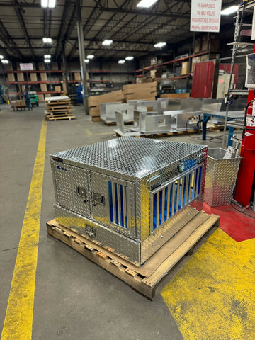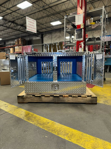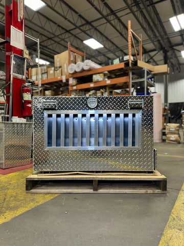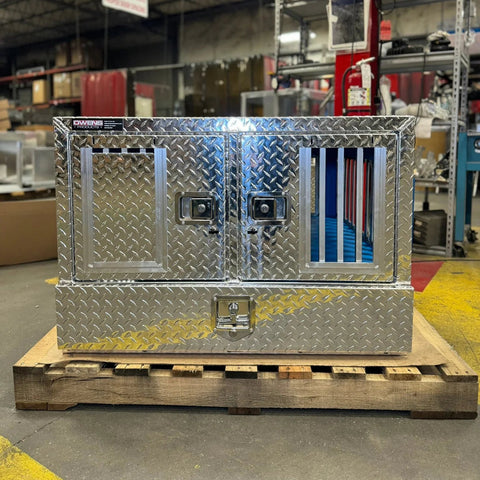 Pro Hunter Series Double Compartment Dog Box with Bottom Drawer Storage. Features a rugged diamond tread aluminum construction with large dual dog compartments lined with plastic corrugate. Convenient lockable lower drawer storage compartment for valuables such as electronics and hunting gear. Lockable slam latch doors with storm covers are slotted for crate cooling fans. Vented with all seasons oversized side (12 x 30) and rear (12 x 12) vents for maximum air flow with storm covers. Center divider has air holes for cross ventilation between the compartments. Premium rattle-free spring loaded carrying handles. D-rings that can be utilized to strap down in your vehicle. All measurements are in Inches.
